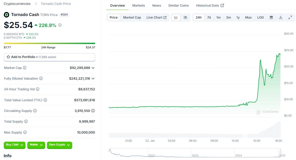 Sau thông tin này, giá token TORN của Tornado Cash tăng vọt hơn 200%, từ 9,5 USD lên hơn 25,5 USD.